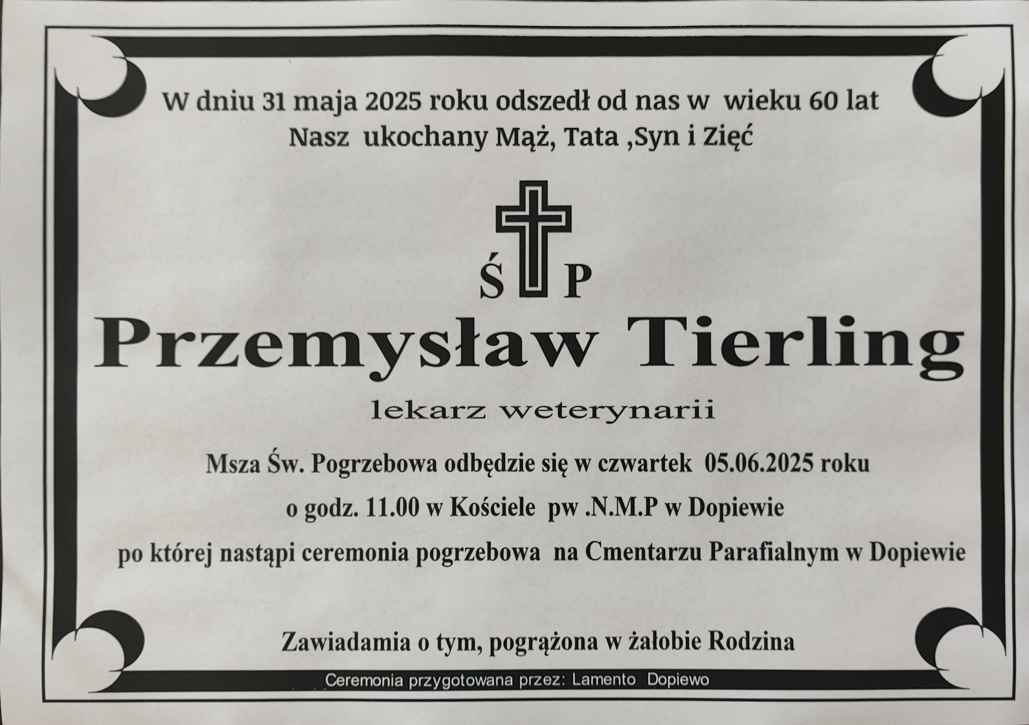 Z głębokim żalem informujemy o śmierci Lek. Wet. Przemysława Tierlinga.